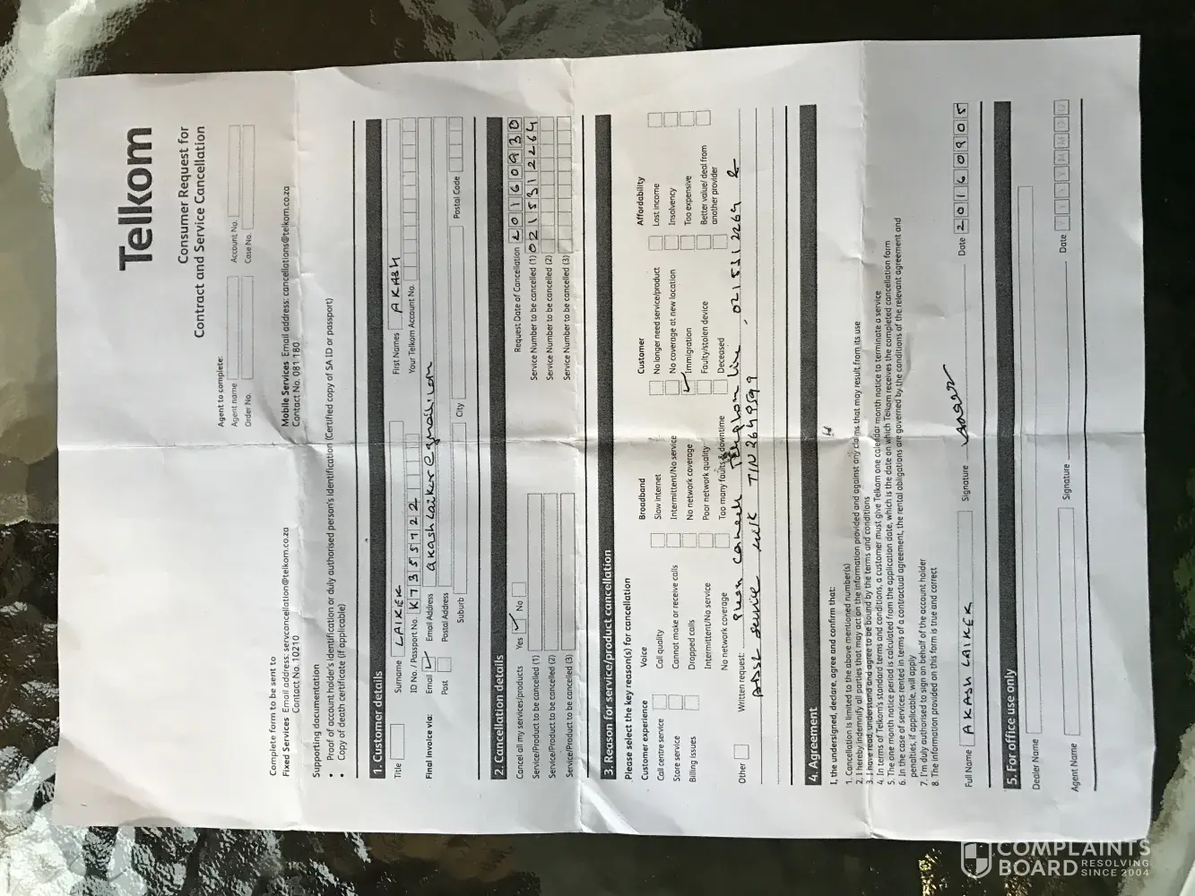 We completed a consumer contract and services cancellation request form and sent it through to [protected]@telkom.Co. Za and [protected]@telkom.Co. Za