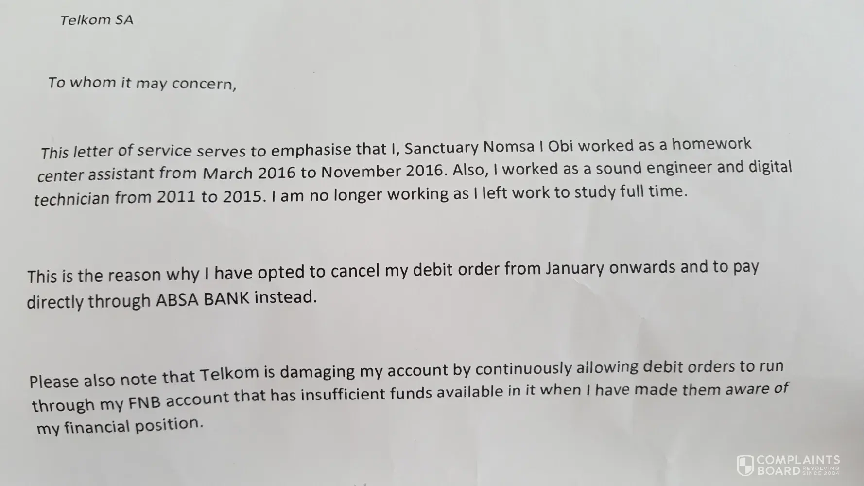 I have consistently asked Telkom to cancel a debit order for my Device with which I have a contract with them. This is due to the fact that I am not longer working and now a university student. Reports have been made to Telkom Customer services, The manager of the Telkom Branch I purchased my device at, even Hello Peter. In light of all this, one would assume that my account would no longer be debited when there is no money in it, but alas, the contrary is true. I have been paying manually into their ABSA account, even paying extra during the course of the month in attempts to get them to not debit my account any further but it has not been helping. I do not understand why Telkom either has not made provision for a case such as mine by being able to stop the debit order (as other service providers are able to) or why no one has taken it upon themselves to salvage the situation. I do not believe that this is the service they intended to provide to their customers so someone needs to help fix this.