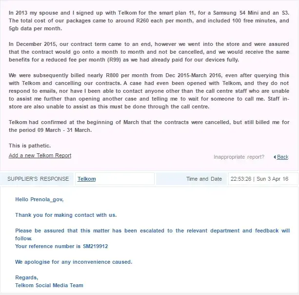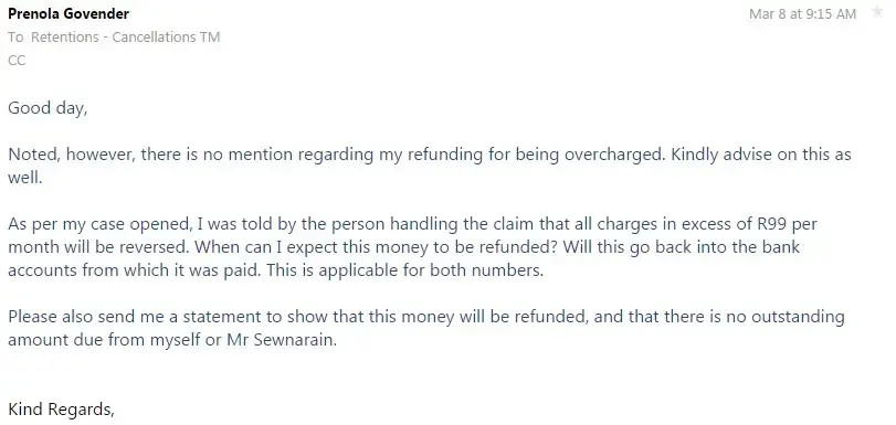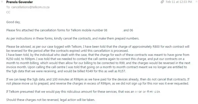 Telkom had confirmed at the beginning of March that the contracts were cancelled, but still continued to bill us for the period 09 March - 31 March.
