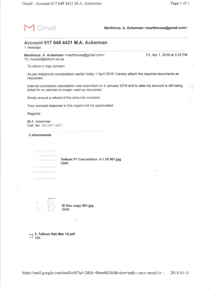 On 1 april I contacted telkom and explained the situation. I was told to e mail all the relevant documentation inclusive of a id copy to [protected]@telkom.Co. Za which I did.