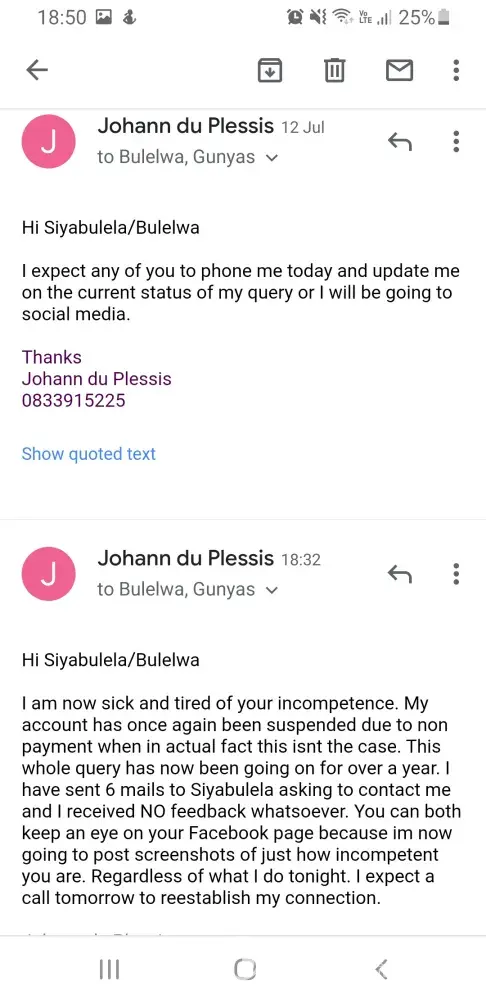 I would like to confirm if you received my below email and whether you would be able to assist me or should I receive your silence as a response and start taking steps against Telkom after today?