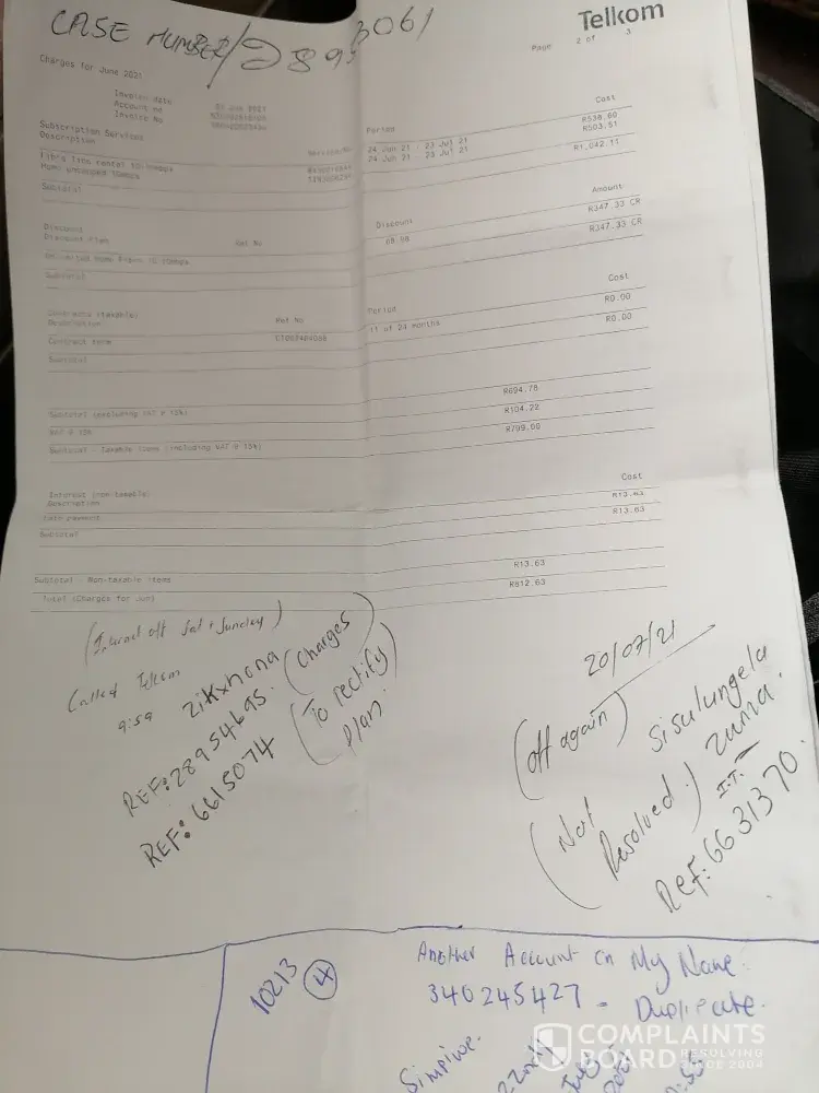 I am now sitting with 2 telkom accounts which one had to be cancelled in May 2021 for R899 and are being debit from my account.
