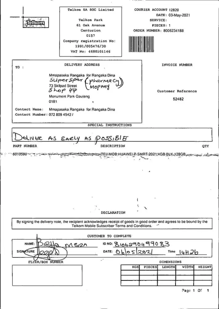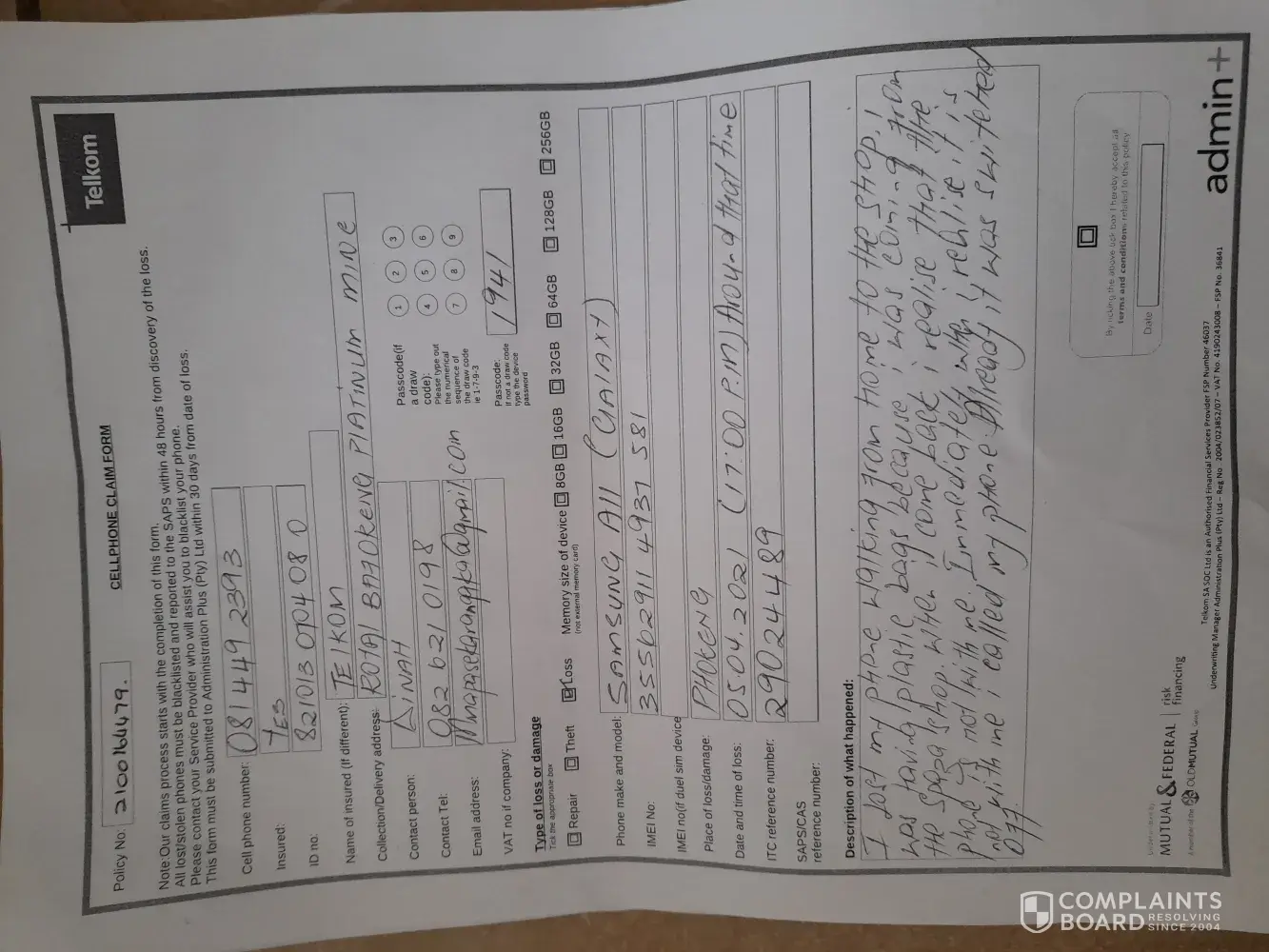 I lost A11 Samsung galaxy phone on the date mentioned above. I went to the Telkom branch where they told me that I have to talk with the Telkom claim via email or via phone so I decided to talk to them via the email of which I have send the relevant document e.g. Affidavit, photo of the Identity Document as well as the cellphone claim form. They then forwarded the Admin+claim no: [protected].Of which I have been talking with them via email. The last email was that the phone was delivered but till today I didn't receive any phone. My question was when and where.