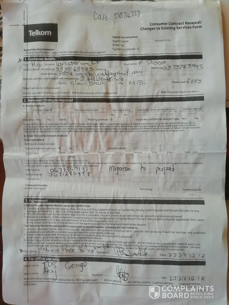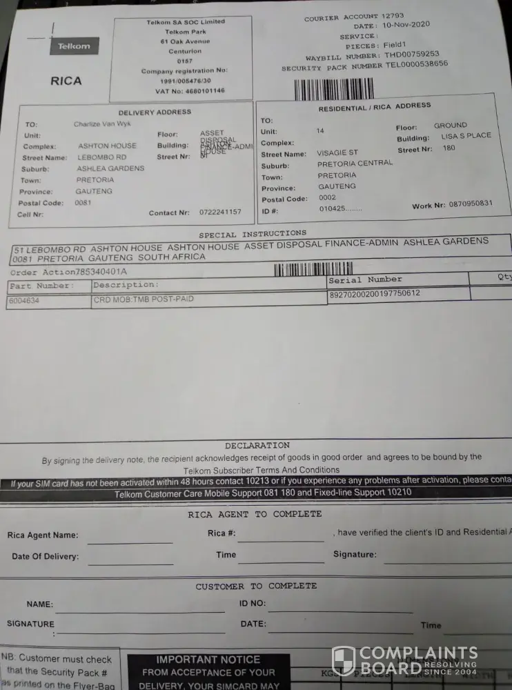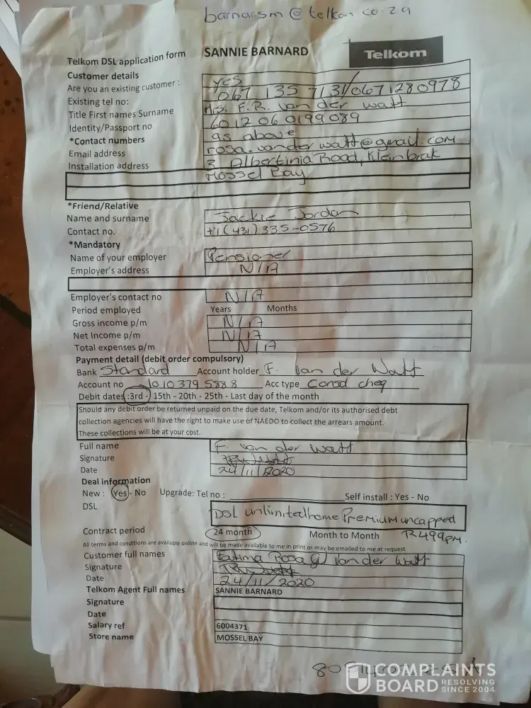 1. I applied for internet service on the 24 of November 2020 (as per attachment) by consultant Sannie (email address [protected]@telkom.co.za).