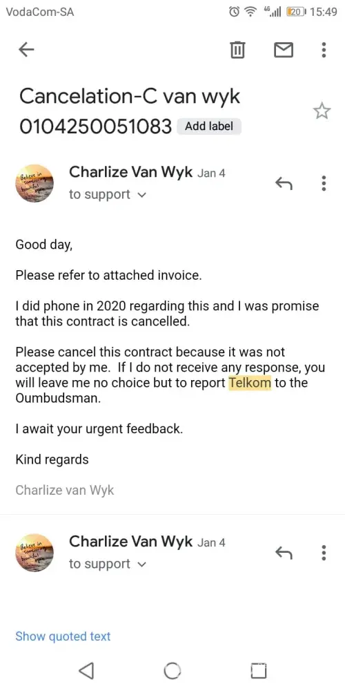 On the same day (5 January 2021) I queried the fact that I had canceled the subscription on my 2 cell phones (document attached) on the 12 December 2020, but Telkom was still withdrawing funds 3 months after I canceled my subscription/debit order.