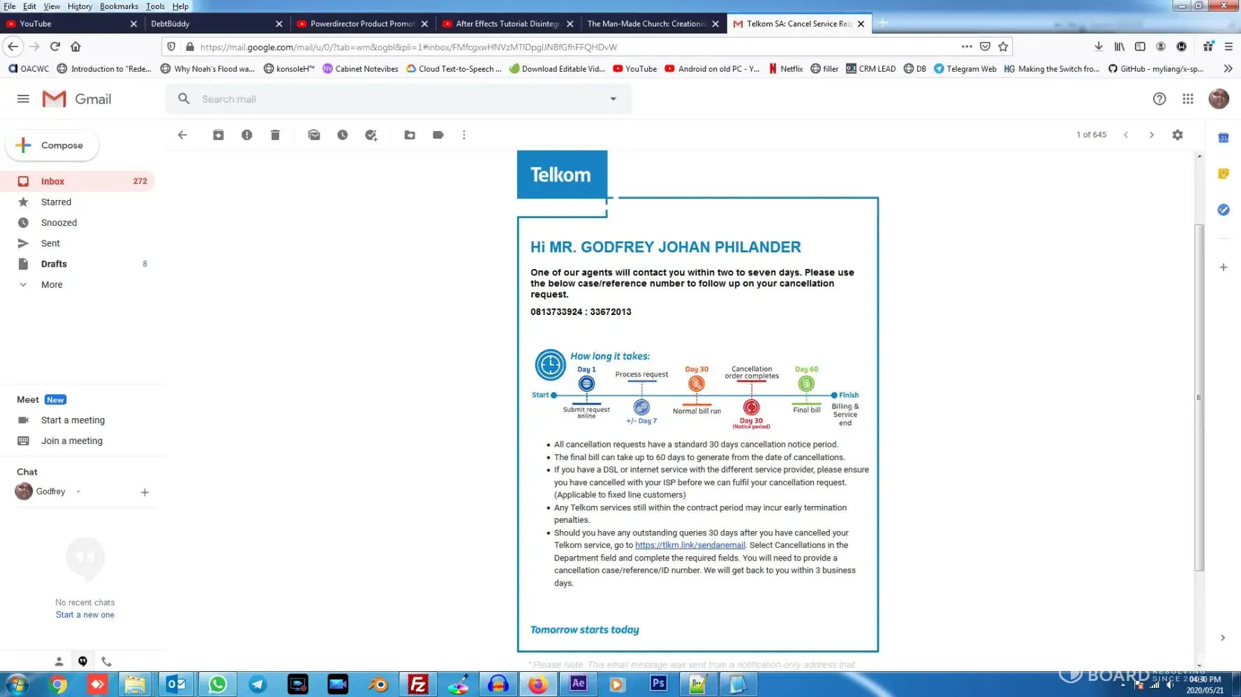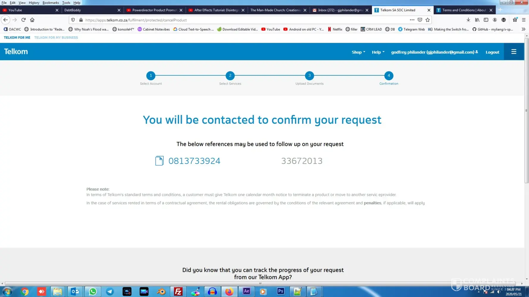 On 21st May 2020 I filed an online cancellation request with Telkom. I received an email back as confirmation of my cancellation request and also that I will be contacted by an agent within 7 days to finalise the cancellation.