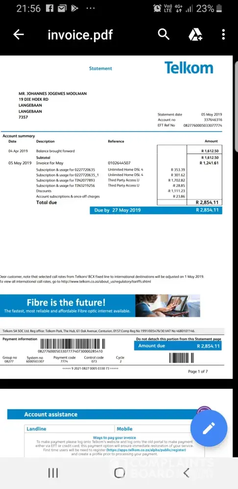 I have moved to the Cape West Coast. I had a fibre line in Jhb. New owner took over the line and contract in Nov 2018. Transfer was done only in March 2019 after several requests and frustration. I am however still billed fir the Fibre line. I have used all means to get this sorted, but it seems like it doesnt bother Telkom to correct their mistakes. It seems like it is a general problem but nothing gets done a out it. I eventually resolved in cancelling all services which was supposed to happen on 1 May 2019. My latest bill again charge me for May services including a fibre line again. I have several ref numbers and confirmation numbers confirming that it will terminate and they will correct the incorrect billing but NOTHING gets done. Where do I go next?