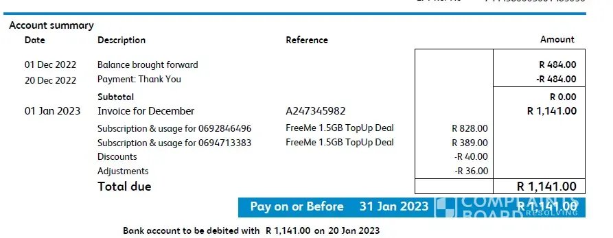 Telkom Account on my SMS messages: [protected]. Account number on my Invoice [protected]. Ive cancelled the following servic hes in November 2022, [protected], [protected], [protected]. Telkom keep on putting the debit order through my bank account. I reverse it every month to get my money back into my account. Now Telkom tread to put me an the Blacklist for I do not pay anymore. Please help me to stop this service, the Ref Nr they gave me after my telephonic conversation to stop this is 1454255939A.