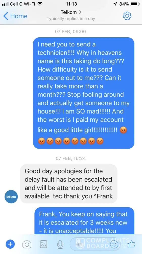 Telkom keep sending technicians and never do they realize that the same house is having the same problems. Just sending technicians to waste my time and their's as well.