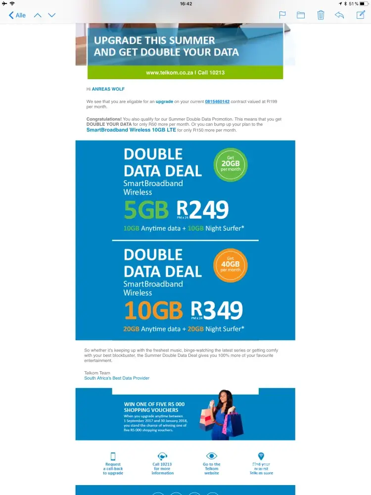 I phoned the upgrade department and they also said that they dont know anything about this email. They only can offer me a contract for r799 per month for 100gb. But they mentioned I should press on the button of the email to request a call back.
