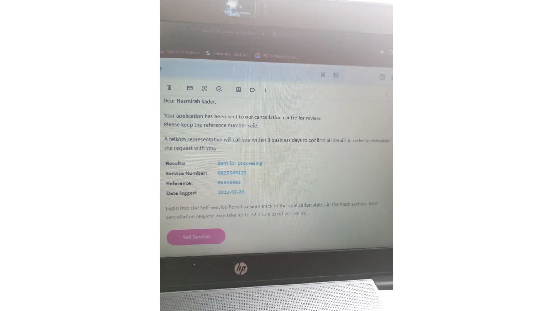 Hi I paid up my telkom account and for the second time now when I call I've been told they logging my quiry for the letter but still u have no response. Can I be please assisted as I need letter urgently. The following is my reference: