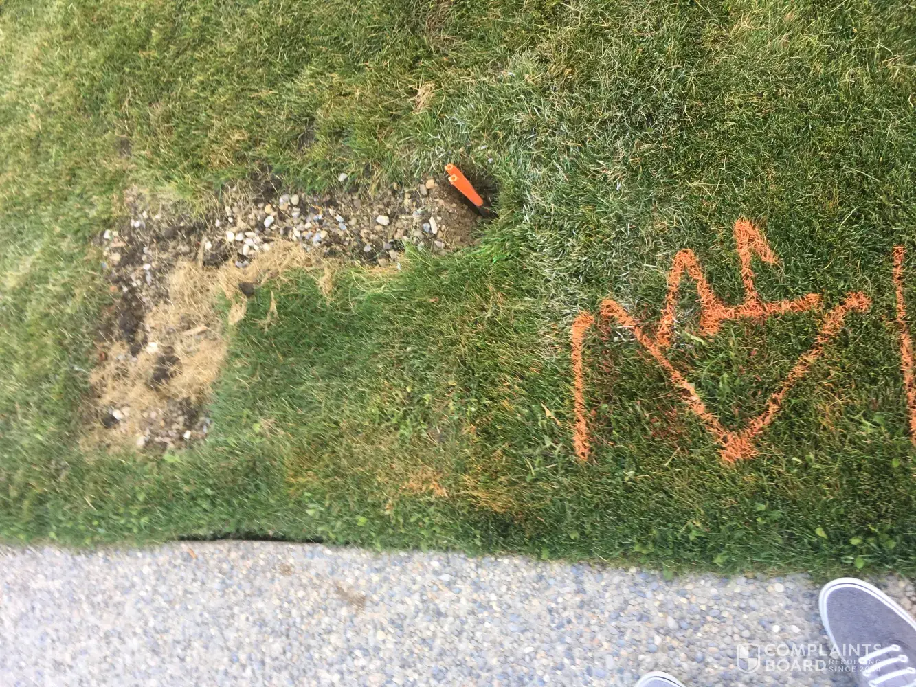 They then dig up from front yard, removed a section of sod, backfilled the area with gravel and left an orange tube sticking out of the ground in my front lawn. They then came by and painted much of my front lawn with yellow and orange paint killing my grass.