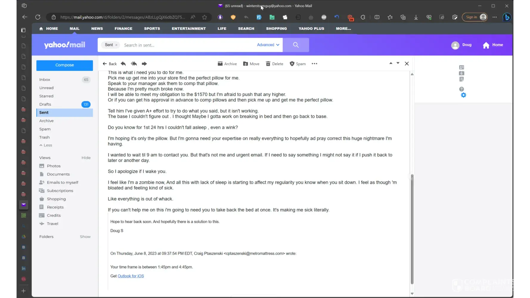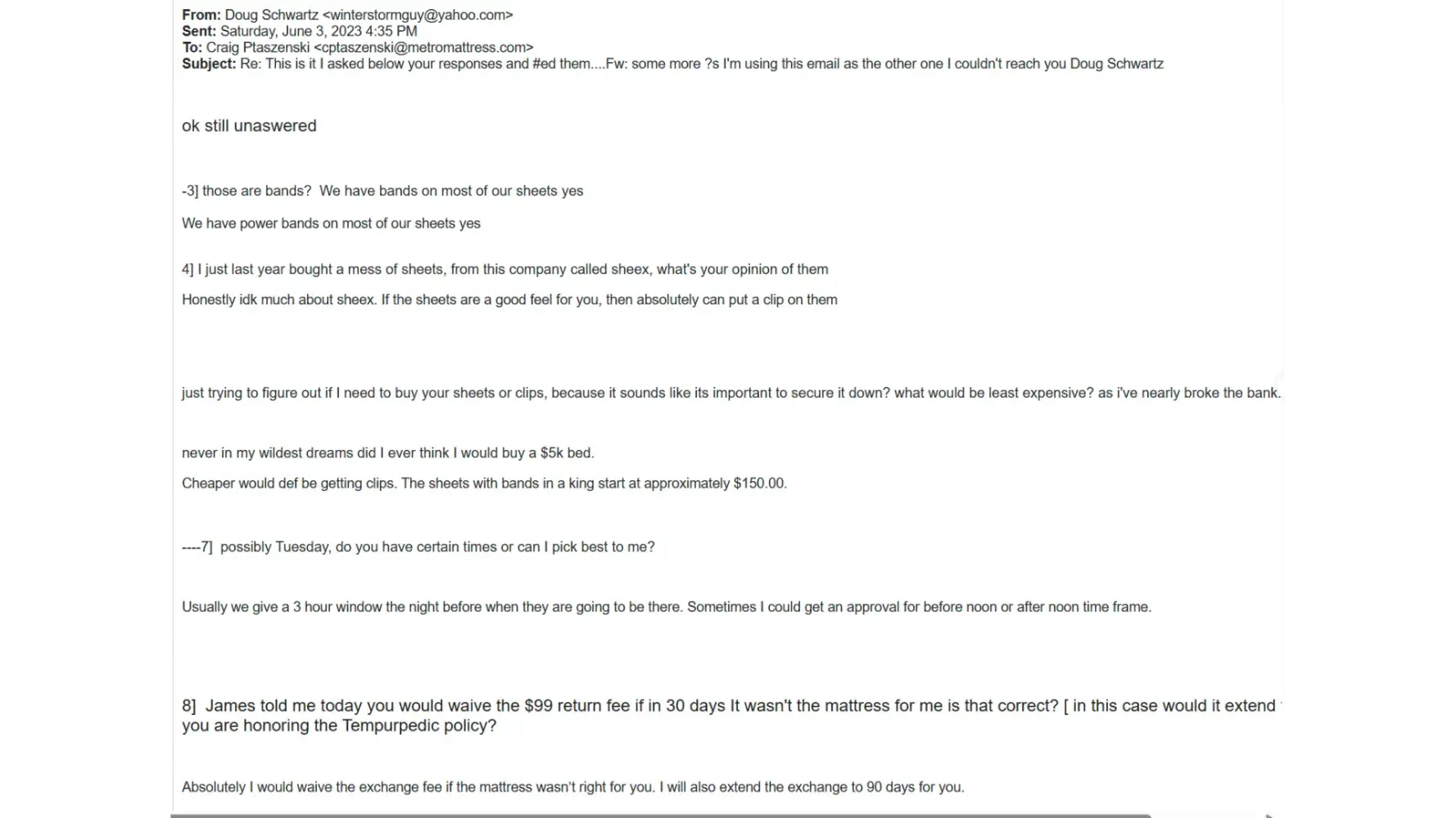 I ASKED HIM BY EMAIL ON THE 11TH AND 13TH DAY IF HE COULD NOT HELP ME WITH THE NIGHTMARE OF NOT BEING ABLE TO SLEEP, THAT I WISH HIM TO PICK UP MY BED AND RETURN IT AT ONCE. HE NEVER RESPONDED.