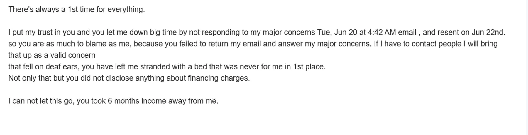 I put my trust in you, and you let me down big time by not responding to my major concerns Tue, Jun 20 at 4:42 AM email, and resent on Jun 22nd.