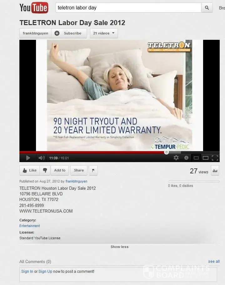 This is a report about our purchase of a Tempurpedic Mattress at Teletron, located at 10796 Bellaire Blvd, Houston, TX 77072, [protected], for the amount of 8, 117.67 charge on September 17, 2012. Teletron claims that it is the Elite Dealer for Tempur-Pedic manufacturer and advertise on TV as well as on youtube about the 90 day free-trial (see...