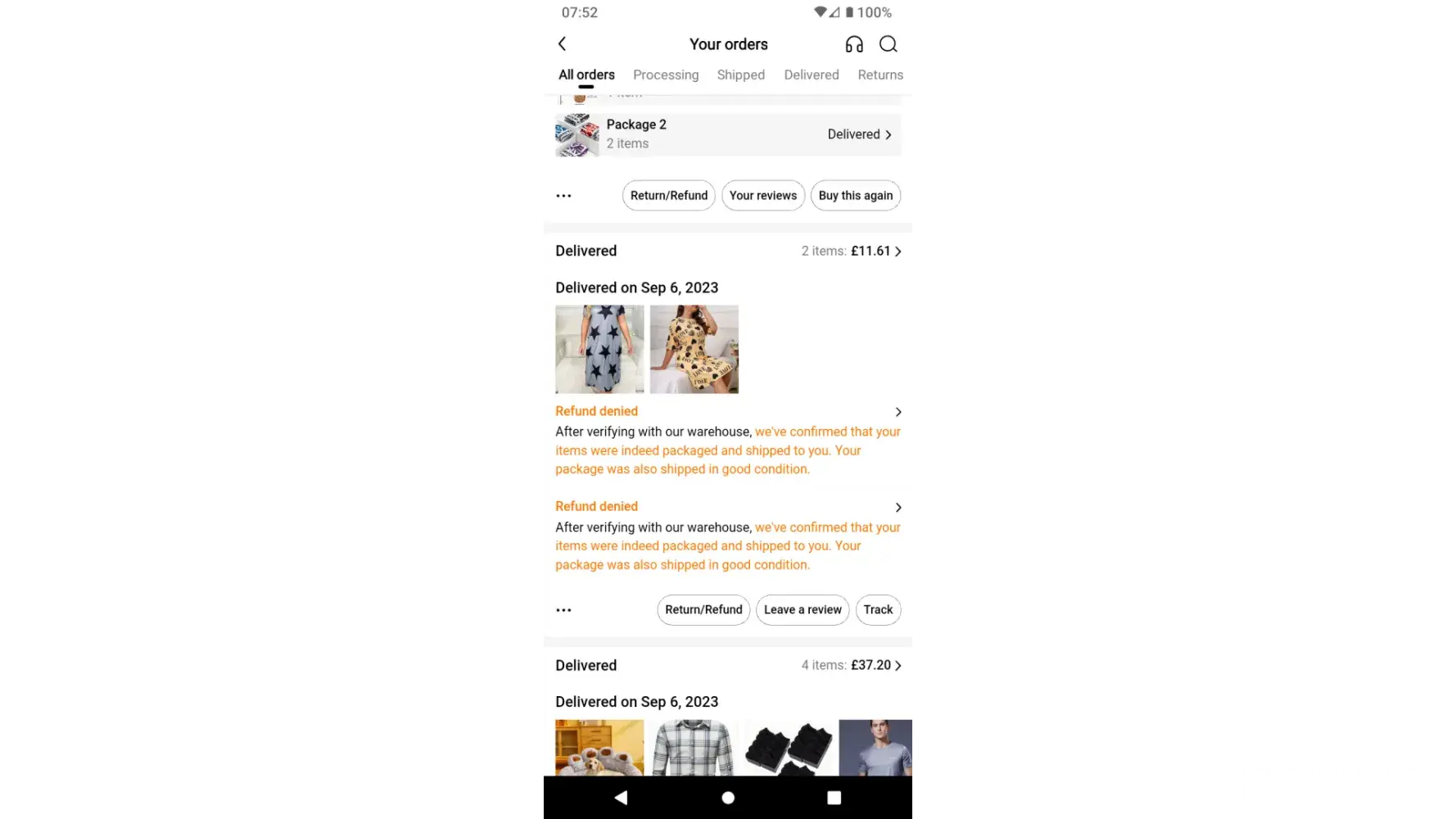Hi I have bought ten items and I returned them all and I have verification from dhl but temu service only refund 6 out of 10 nd they said that they didn't received the four but this is lies When I asked them to send me the verification vedio whole opening the paket they refuse I complain that they shoils refund me the four items amount 450 kr Look what...