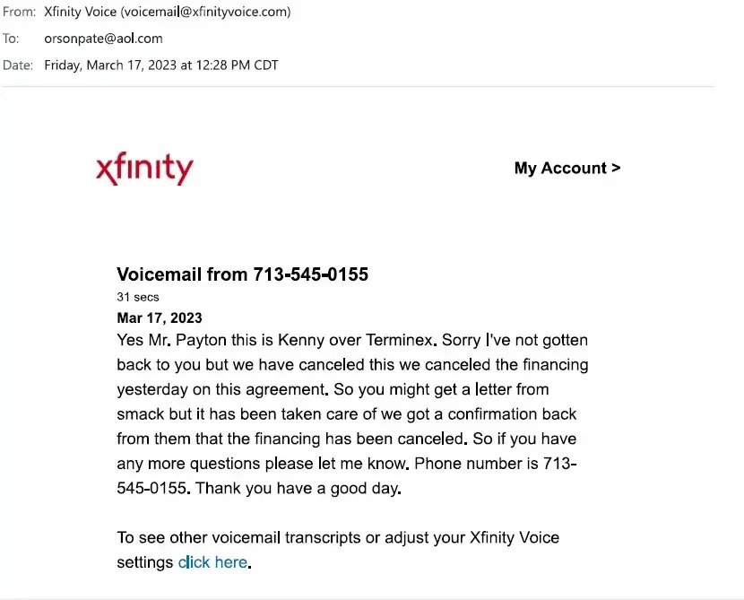 However, I am still getting collection calls from ServiceMaster. ServiceMaster indicated to me that they never received the proper paperwork from Terminex to properly cancel the financing agreement. I am writing to request escalation of this matter and requesting someone in upper management at Terminex contact me back to finally resolve this issue. I may be reached at the following number. Sincerely, Orson Pate.