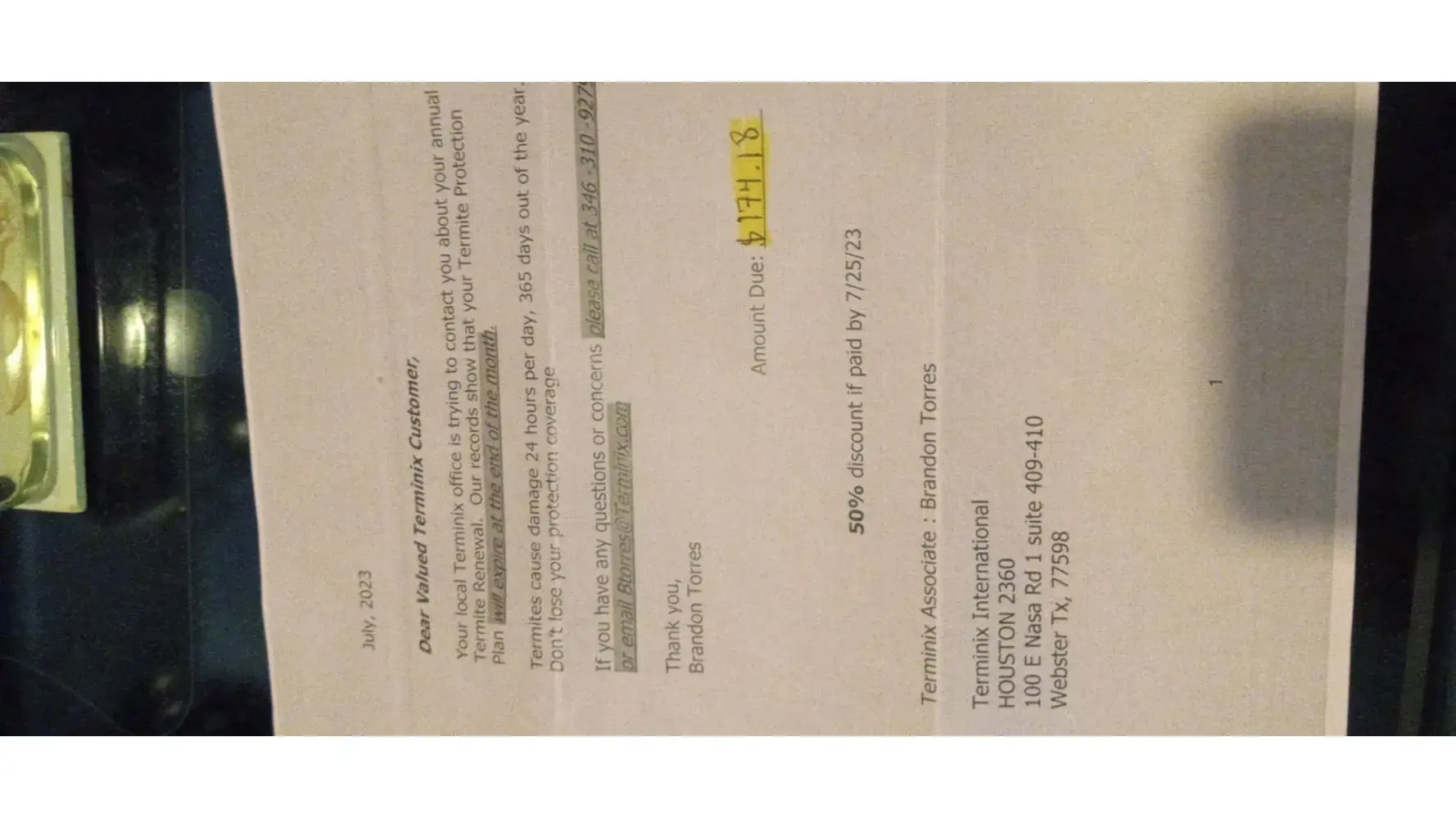 So I chose not to renew the service contract. Today I received a letter on pink paper with a handwritten amount due that was highlighted. This looks like a past due bill. No where does it explicitly state that it is not a bill. If I were an elderly person with cognitive decline, I would have thought I owed Terminix a past due amount. This is a highly deceptive practice. Not a single complaint ever filed with a Terminix employee has ever been acknowledged or resolved.