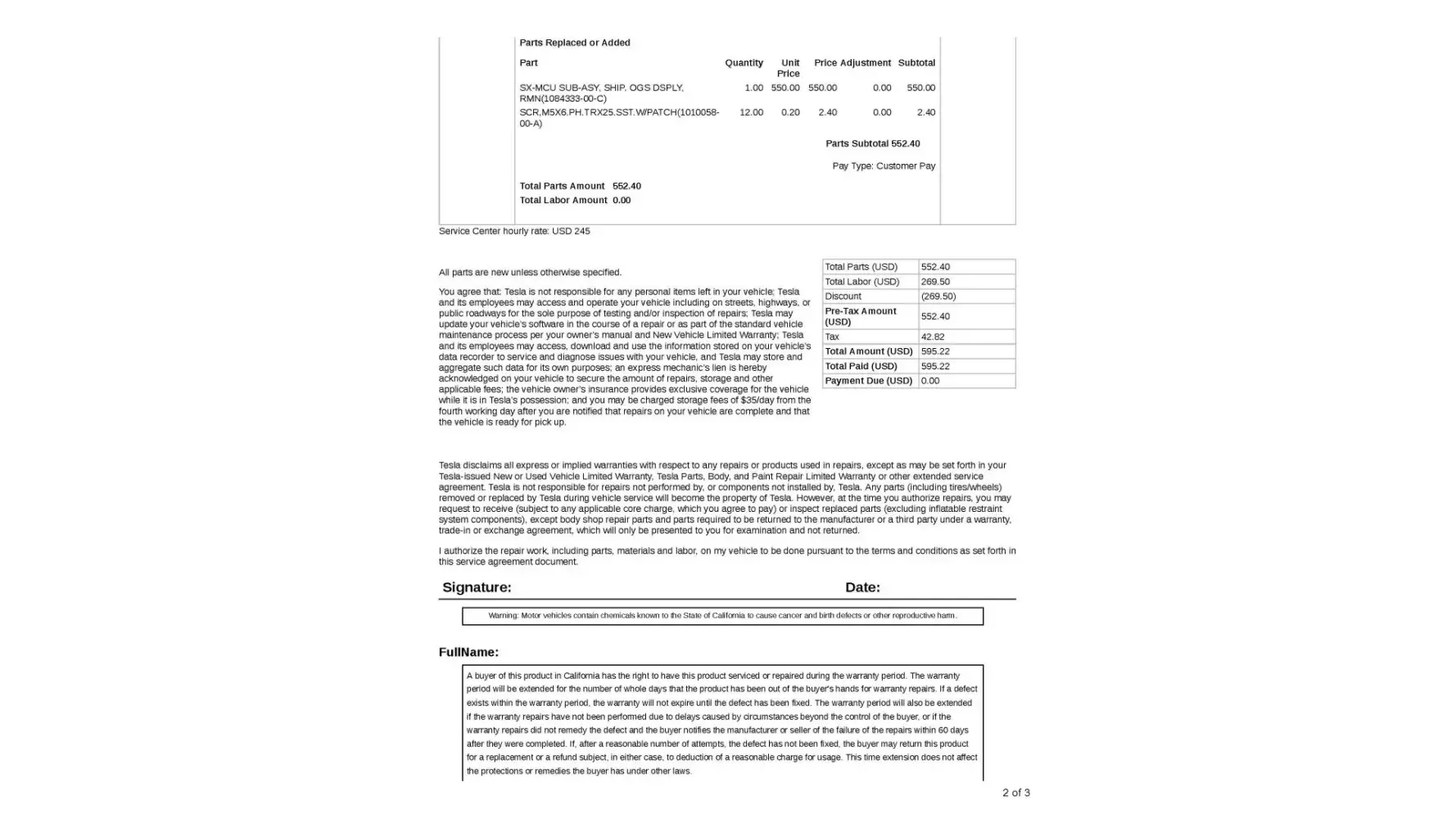 I believe the cost of replacement is Tesla’s responsibility because Tesla manufactured the vehicle in which the defective product was installed. I would like to be reimbursed for the cost of replacing this defective part. I respectfully request full reimbursement without delay.