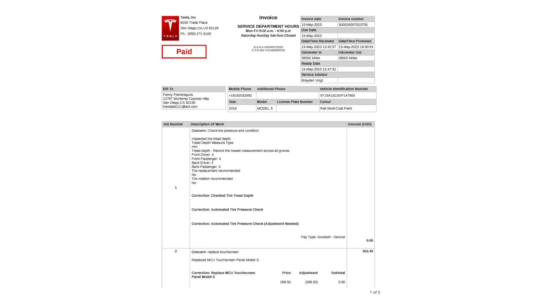 I got a representative to come out and take pictures-It just so happened she was also in charge of the paint shop and made a ticket for me and said it would take 2-5 days. I left the car asked for Tesla to get an Uber as my wife came with me but had other commitments in Tysons. The representative said she would be in touch with me throughout the week to let me know how the repairs were going and possibly they might get the car fixed before 5 days.