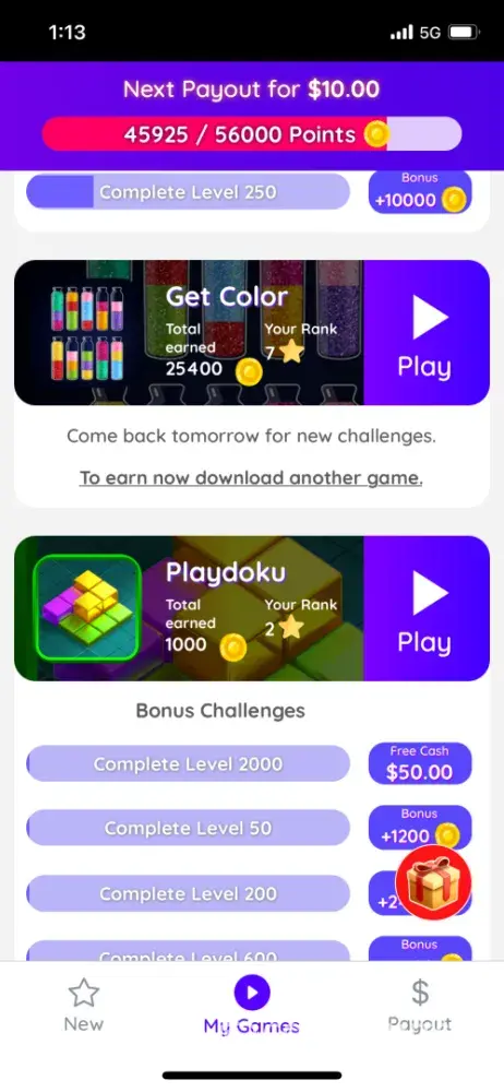 Ok, first the positive- This is a cute little app and the many of the game characters and app graphics are adorable (ironically the cute little star emoji with the heart glasses is what persuaded me to leave a review lol). I made 4 dollars within a couple days and cashed out via Amazon gift and my payment arrived in less than 10 minutes (honestly the fast payout is the best thing about this app, I’m my opinion). However if you download this app you’ll have to use several apps to even get a few dollars if you don’t want to spend any money on upgrades/prizes in the game. One example of this is the Dice Dreams game where you make the equivalent of 1 dollar after advancing to Level 5 and there’s an “offer†on this app’s homepage to get 3 dollars for spending money in the Dice Dreams app. Like I said, if you’re ok doing that then that’s fine but otherwise, no offense, I’m personally disappointed with this one.