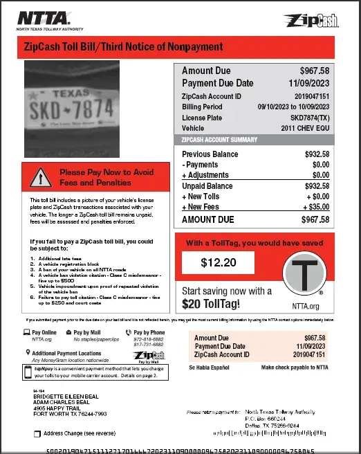 Around July I started receiving bills from NTTA that the tolls were not being paid.