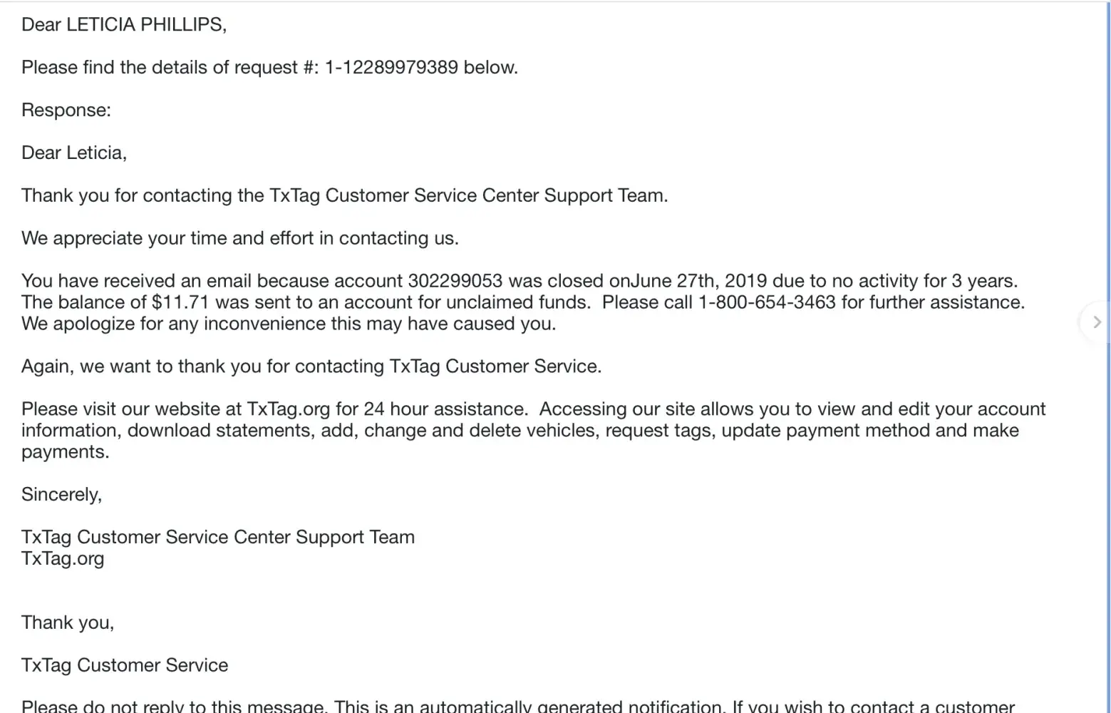 The only response from TxTag was to send me another invoice in September 2019 for late fees and additional charges on an invoice that had already been paid and disputed. I again paid the invoice and disputed the charges. I also disputed the charges by registered mail sent to the customer service center which they received on 9 September 2019. I have received no response from TxTag.