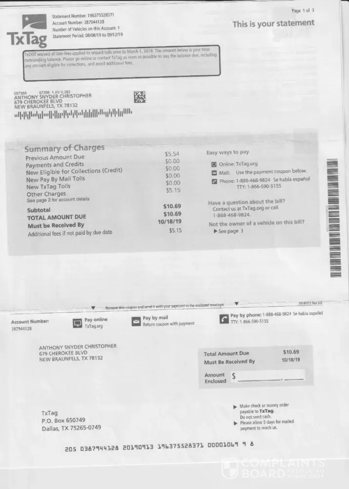Texas Department of Transportation / TxTag.org Fraudulent toll bill
