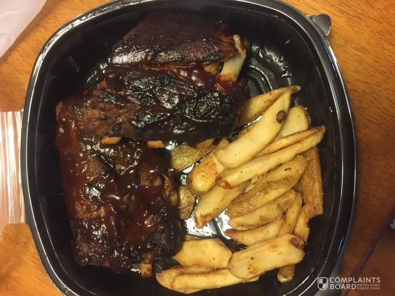 My first complaint about my visit was they were out of rolls, and butter, and did not have to go cups. Secondly, I ordered one full rack of ribs(as my receipt reads) with a side of fries, and I also ordered an extra side of fries. I ordered a raspberry tea to go and they gave me 2 kids to go cups. The ribs and fries I was given was not adequate for the $25 that I paid. I will include a picture of my ribs, and the fries I was given. Very disappointing.