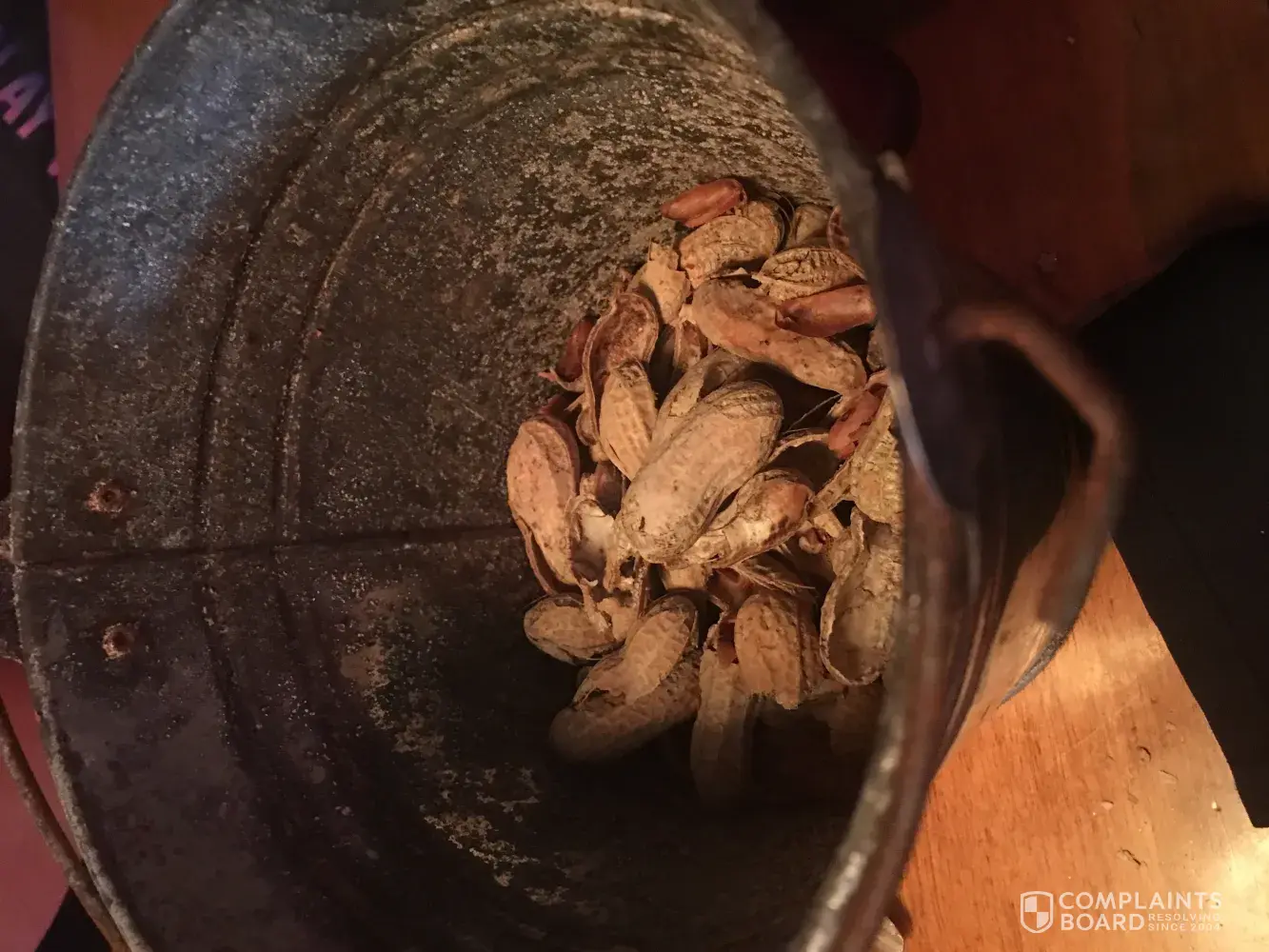 The peanuts are were stale and the Galvinized Bucket were very nasty. Our bucket at our table was very rusty and had a lot of calcium build up on them. When touching the buckets they have a texture and stink like a wet old bucket. Possibly put a liner in the bucket or something to help prevent the staleness to the peanuts. Possibly go to a plastic bucket or something that could be washout.