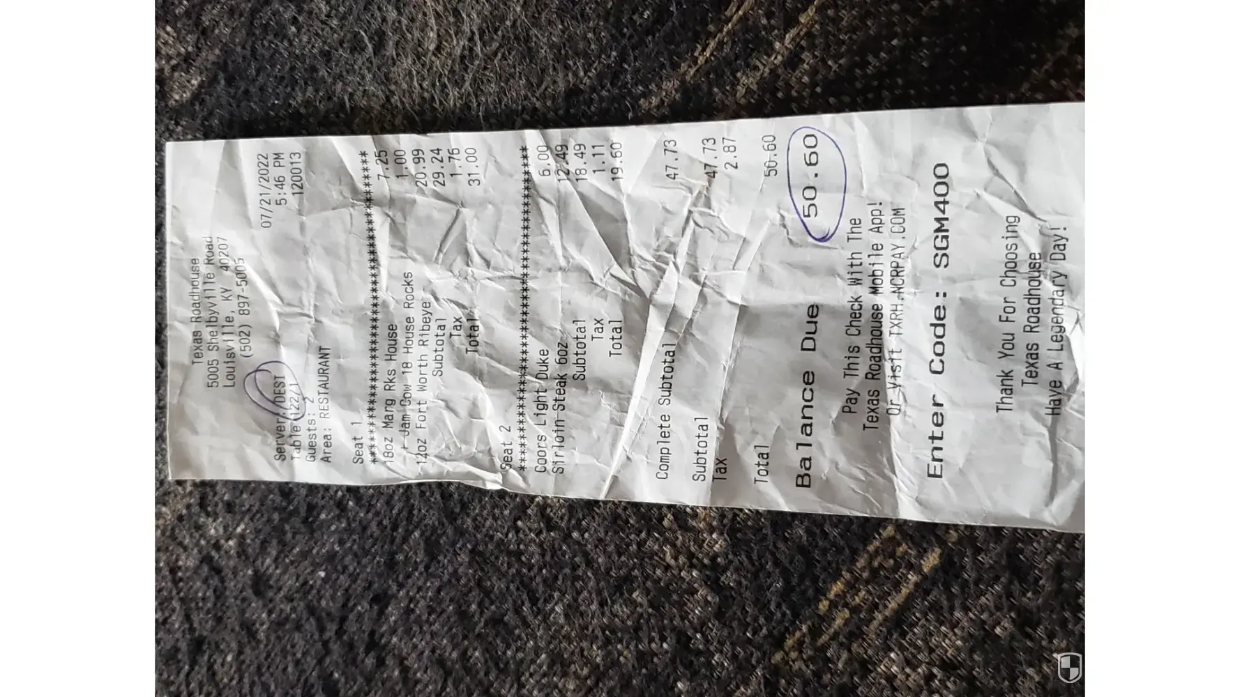 On 08/05/2022 My family and I sat down for dinner at 8:30 ish. I ordered the steak and ribs combo, cut my steak put in my mouth and I noticed something on the knife, which was food stuck on the knife. Immediately it turned me off. I asked plastic utensils and nibbled, didn’t enjoy it at all after that. Also today I look at receipt and she charged me for a margarita with sangria 18 rocks. I did have two drinks but someone else paid for it.