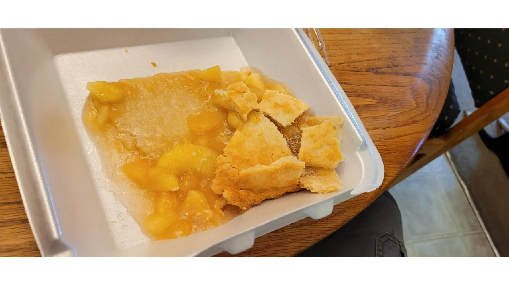 Everything was fine except the apple pie. See Photo. We think it was dropped or thrown. See photo. The pie was $6.99. The condition of the pie was unacceptable.