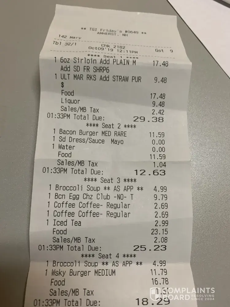 I visited TGI Friday's in Amherst, NH yesterday with a group of residents from the nursing home I work at. Including staff, there were 9 of us total. We asked that the bill be split so each person would have their own check, which was done. Each person paid in cash except for myself, who paid with a debit card. My card was charged 3 times! Twice for the exact amount of my meal, and once again for the entire table (so I paid for my meal 3 times and then paid a second time for each person who paid in cash).