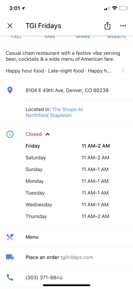 Still craving TGI Friday's, I decided to google another location, 8104 E 49th Ave, Denver, CO 80238, this one said it was open untill 2 am. So I drove another 13 min to this location only to be met with locked doors, at 1205 am.