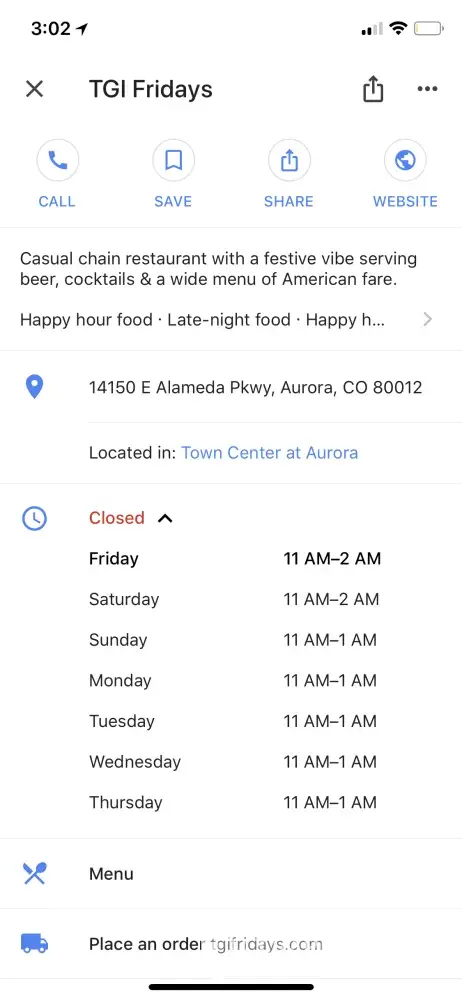 I searched on google for TGI Fridays, the first one I found at 14150 E Alameda Pkwy, Aurora, CO 80012 said it was open until 1am, so I drive there, which took 15 min and I get there at 1145 pm. Upon arrival, the bartender says the kitchen was closed at 1130 pm and they were just serving drinks because he said "it was slow. Unacceptable.