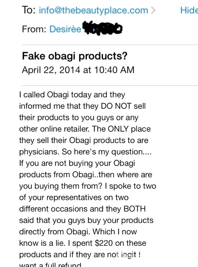 I bought Obagi from this website AFTER speaking with one of there representatives about where they get there products to make sure it's legit. She assured me that they get there products directly from obagi. So I went ahead and spent $220.00 of the red obagi products. To make an extremely long story short. Later on after speaking to an obagi representative she told me that they DO NOT sell to thebeautyplace.com! I ended up going to a licensed dermatologist and getting the exact same obagi from there to compare and contrast the two. Didn't have the same consistency nor smell. I called the beauty place.com to tell them about my great investigation work and the manager wasn't too thrilled. She was yelling at me, talking over me, and calling me a liar. She also told me that since I opened the product that I can't get a refund. So I thought I should just warn the rest of you who are thinking about buying anything from this website. DO NOT! They are a scam and this is not the first complaint of them putting fake substance in there bottles. DO NOT BUY FROM THEBEAUTYPLACE.COM! Use your money elsewhere!
