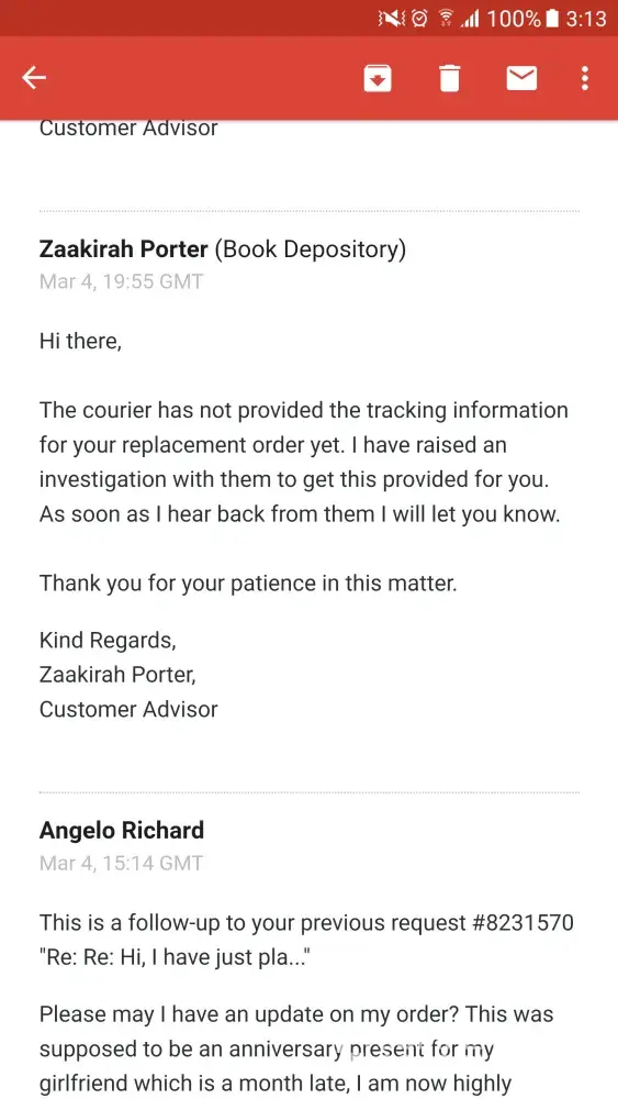 I am speechless. For the past 2 days, I have been bombarded with rude, bullying emails from people who say they work for The Book Depository. Not only have they repeatedly refused to even read my emails, they keep calling me by the wrong name (as if they are replying to a different email? Who knows?) and send me rude comments and stuff. Has anyone else had that experience? I was hoping for a replacement, because they sent me the wrong book, but the people on the email refuse to even check the isbn. Is this spam? Has my account been hacked? I can't believe this is TBD, they have been plite and professional in the past.