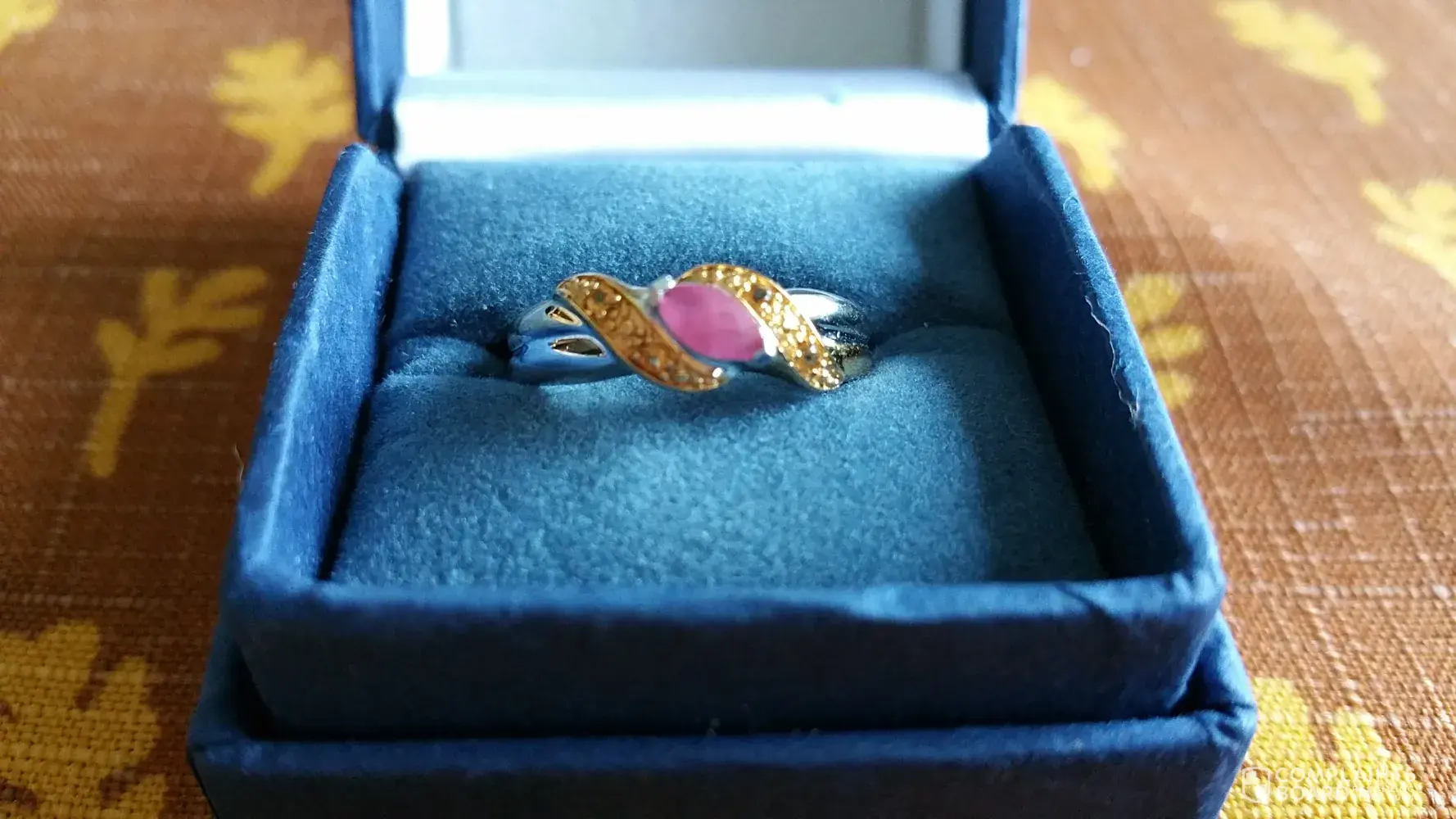So I complained.in early november, a ring showed up. Covered in "made in china" stickers, this "handcrafted beauty" had a stone that looked like a broken piece of pink plastic. Nothing like the red, clear ruby in the advertisement.