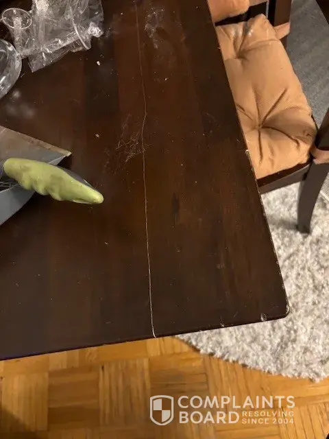 My new couch was delivered and set up. When the delivery people were done and ready to leave, one of them was texting on his phone and backed into a wooden shelving unit which crashed against my dining room table and then crashed to the floor. It cracked my dining room table and broke the shelving unit. He tried to put the shelving unit back together and...
