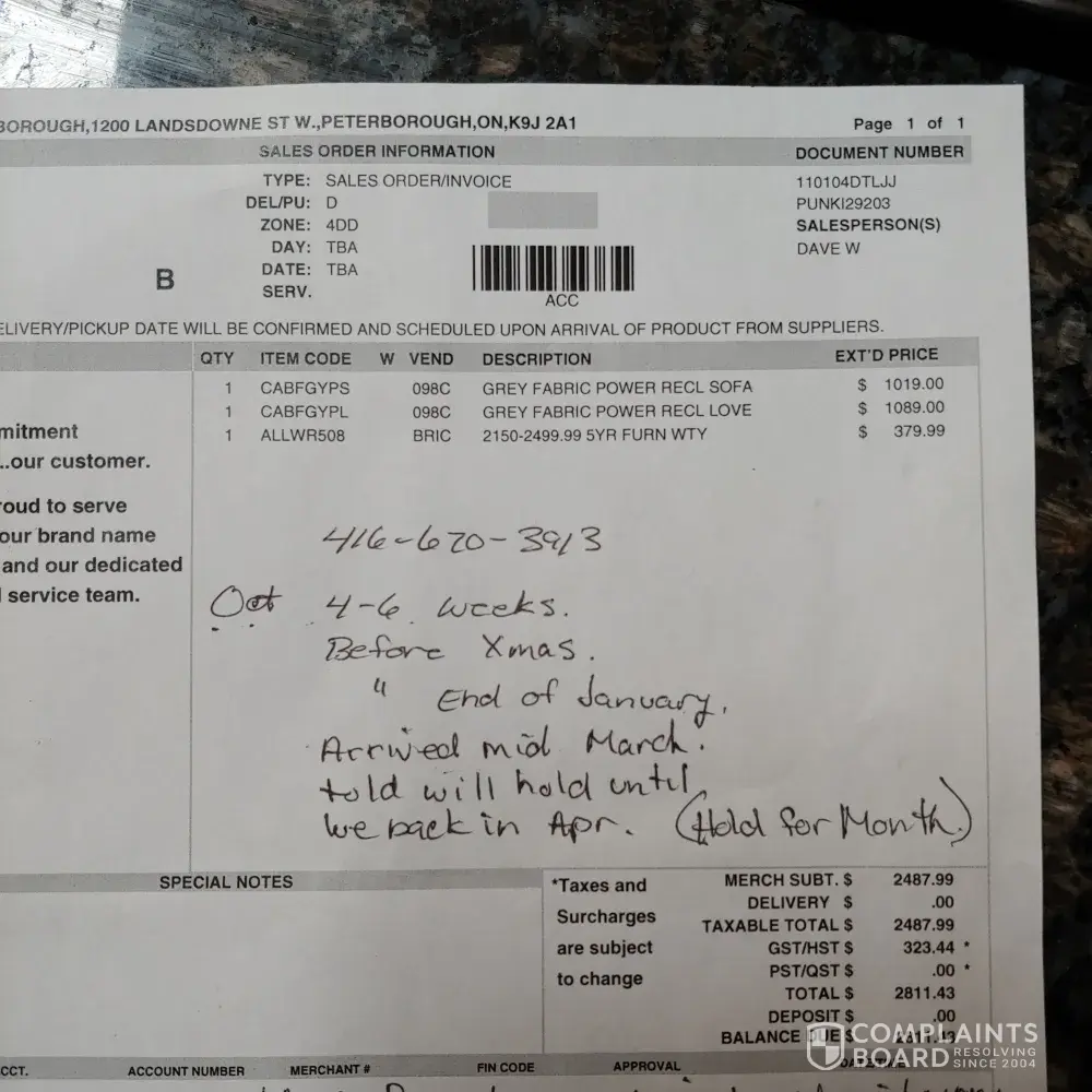 Ordered a couch and love seat in October 2020. Was told 4 to 6 weeks. Order was delayed was to get before Christmas. Delayed again was to get by end of January. Finally was in the warehouse the 2nd week of March. We were out of the country and were unable to receive a delivery. Our son was 2 weeks quarantine. Back in Canada 4 weeks after the proposed mid March delivery to find out that the Brick would only hold our couches for a week. Sold our couch to someone else. After being told that they would hold our couches no problem. Now we are being told we should have our couch and love seat in 4 to 6 weeks. Ok the first order took 5 months to get to the warehouse.