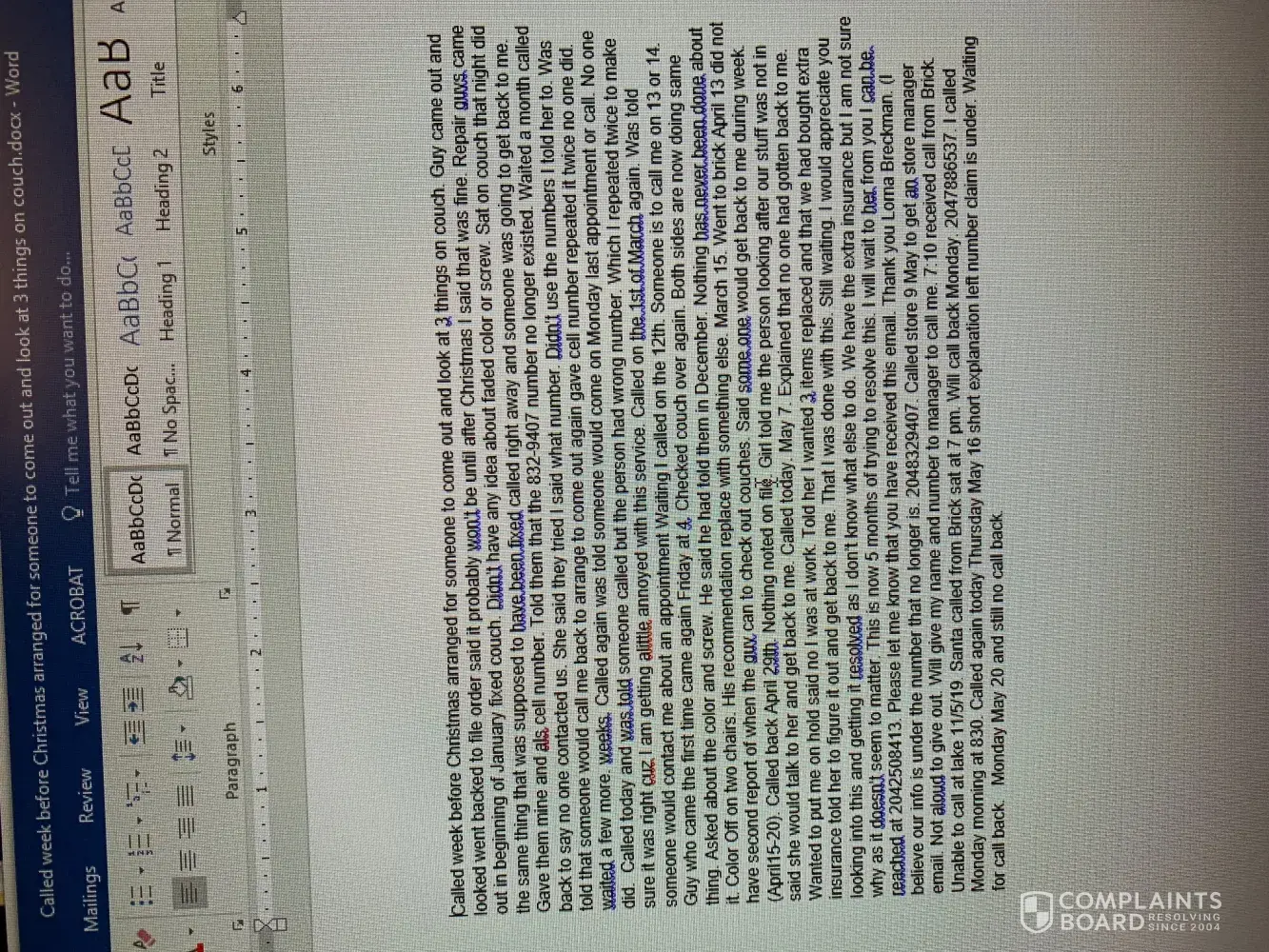 I have attached a letter in the pic explaining all that has been going on with my claim. Not sure what the issue is as getting it resolved has not happened. We purchased the extra replacement insurance. I have been trying to resolve this for over 5 months now. The claim is under [protected] Al and Lorna Breckman. We had a guy out twice to look at furniture and the last time he said he would suggest them replacing with something different same value. I want this resolved, I want my furniture either replaced with something of the same value or the same couch and chair, although the guy did say it is a design flaw and would possible to the same again. I want it done within the next couple of weeks as I have already waiting I think long enough. Al [protected]) or Lorna [protected]) . The number the claim is under does not exist anymore (204-[protected]) so do not call it.
