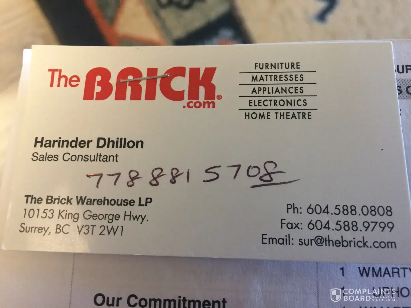 In addition, the sales person Harinder Dhillon then started threatening us by saying that the Brick has a lot of lawyers. We're old and on pension. We just want our sofas fixed as per warranty. We're attaching pictures including of the sales order and sofa.