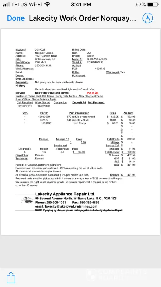 Bosch DIsh Washer purchased June 25/18 had few glitches in beginning but seemed to be just getting used to then the glitches became everyday... would not complete its cycle for possible 3-4 starts we were unavailable for November and part of December so January went into local store they just told us to contact Bosch (not their customer service would do for us!) gave us number in England like excuse me finally got ahold of someone in California who seemed anxious to help gave us name of repair (local) process started now everything except the outside cover and the racks have been replaced and it still cannot complete a dishwashing in one start needs to be switched to another cycle sometimes 5x very annoying and I am in anarea where water is not free I have 1350gals to last 10 days most recently March 11 last repair done and repair sent word saying nothing else they can do the DW is a lemon and should be replaced. When I approached staff at store they indicated it wasn't their problem told me I could not bring back for refund the little miss at counter Courtenay actually told us there was no number for head office that they couldn't even call there was no email or phone number they could give us we feel we have been abandoned and like we have an $850 boat anchor in our kitchen. Thoroughly disappointed in how we have been treated and the "top notch" product we supposedly bought. My name is Louise Norquay my phone number is [protected] or home [protected] at this point I just want someone to call and at least explain why we are not worthy of having answers orbhaving the product replaced... Courtenay is a waist of skin when it comes to customer service however Tristan couldn't be bothered to even call so I'd say the ball is in your court but clearly the Brick doesn't do business with people it just does as much damage as it can then leaves you hanging... not impressed