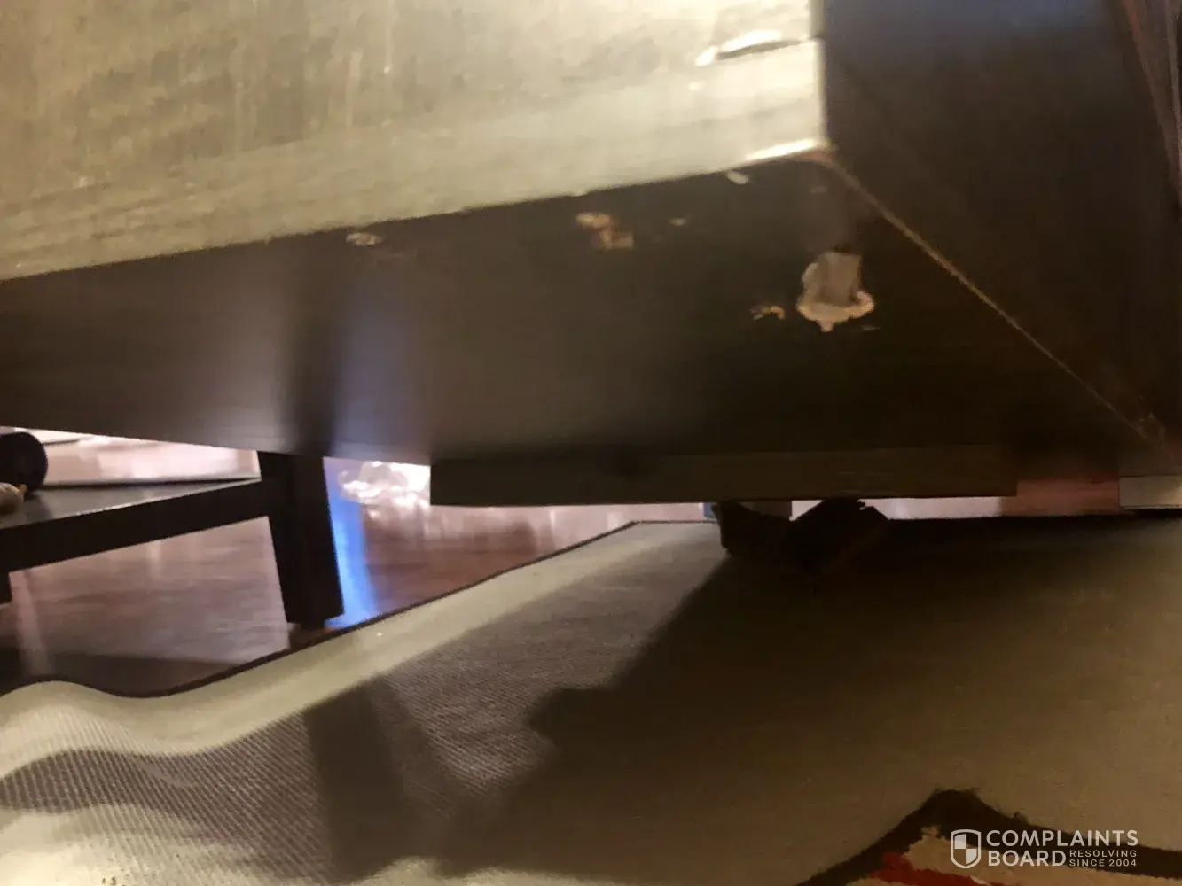 Today the delivery men brought the items. They did not offer to take off their shoes. They left the box holding the parts for the bookcase on the floor so I did not notice until this evening when we moved the box and started to assemble it that they left 4 large marks on my carpet, either from their dirty shoes or from dragging the chest across the carpet. These marks were not there prior to the delivery men's arrival.