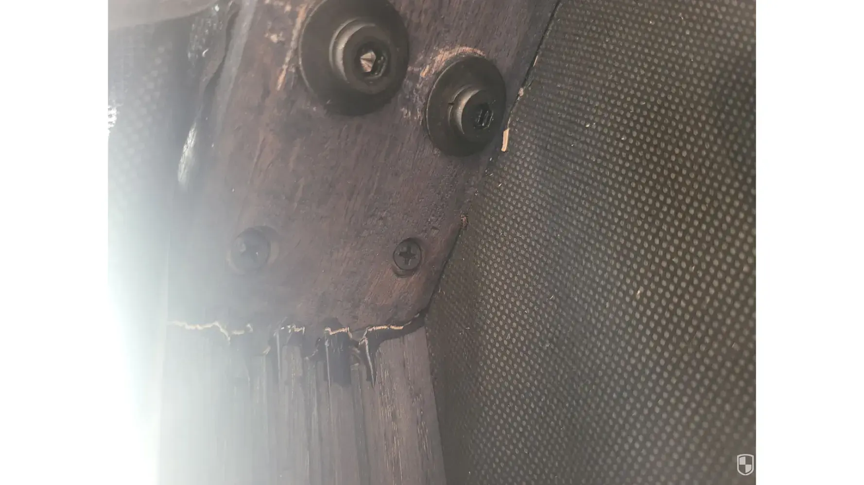 Furthermore, upon flipping the couch, I discovered old holes where the legs were previously screwed in. Shockingly, one leg was missing entirely, causing one side of the couch to sag and preventing the two sections from securely locking together. As a result, the couch slides apart whenever someone sits on it, posing a safety hazard and rendering it unusable as intended.