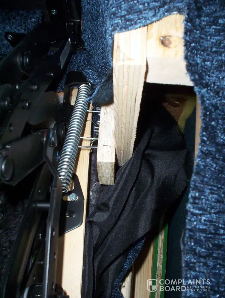 I PURCHASED A NAVY RECLINER IN JUNE 2012 .NOT EVEN A YEAR GOES BY AND MY RECLINER IS FALLING APART. I'M A SENIOR WHO LIVES ALONE AND IM VERY CAREFULL WITH MY FUNITURE.I WENT TO THE BRICK TO COMPLAIN BUT THEY TOLD ME .THEY WILL NOT DO ANYTHING FOR ME. BUT I HAVE PURCHASED A FULL 5YEAR WARRANTY AND CONSTRUCTION WARRARENTY AND A MASTER WARRENTY. THINKING IM COVERED FOR MY 5YRS.BUT IM STILL FIGHTING THEM, FOR MY MONEY BACK FOR THIS JUNK I HAVE PURCHAED. PLEASE IF YOU COULD HELP ME OUT I WOULD APPRECIATE THIS.