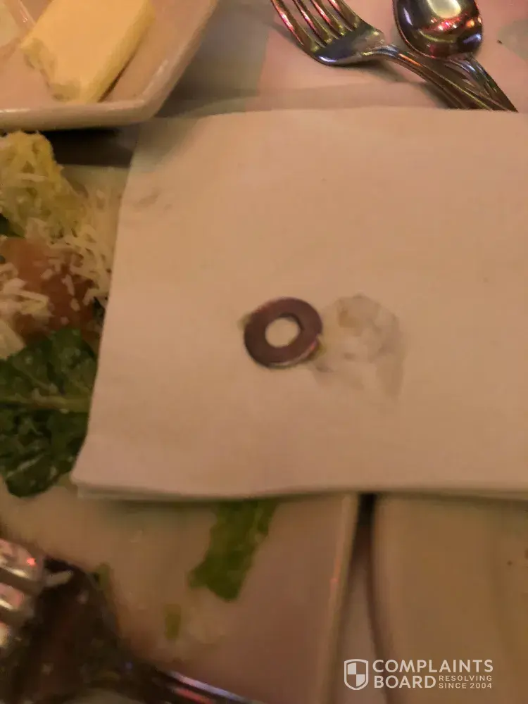 Cheesecake factory Stoneridge Mall (Pleasanton California) Location, I was served a *Metal Washer* in my Caesar Salad...