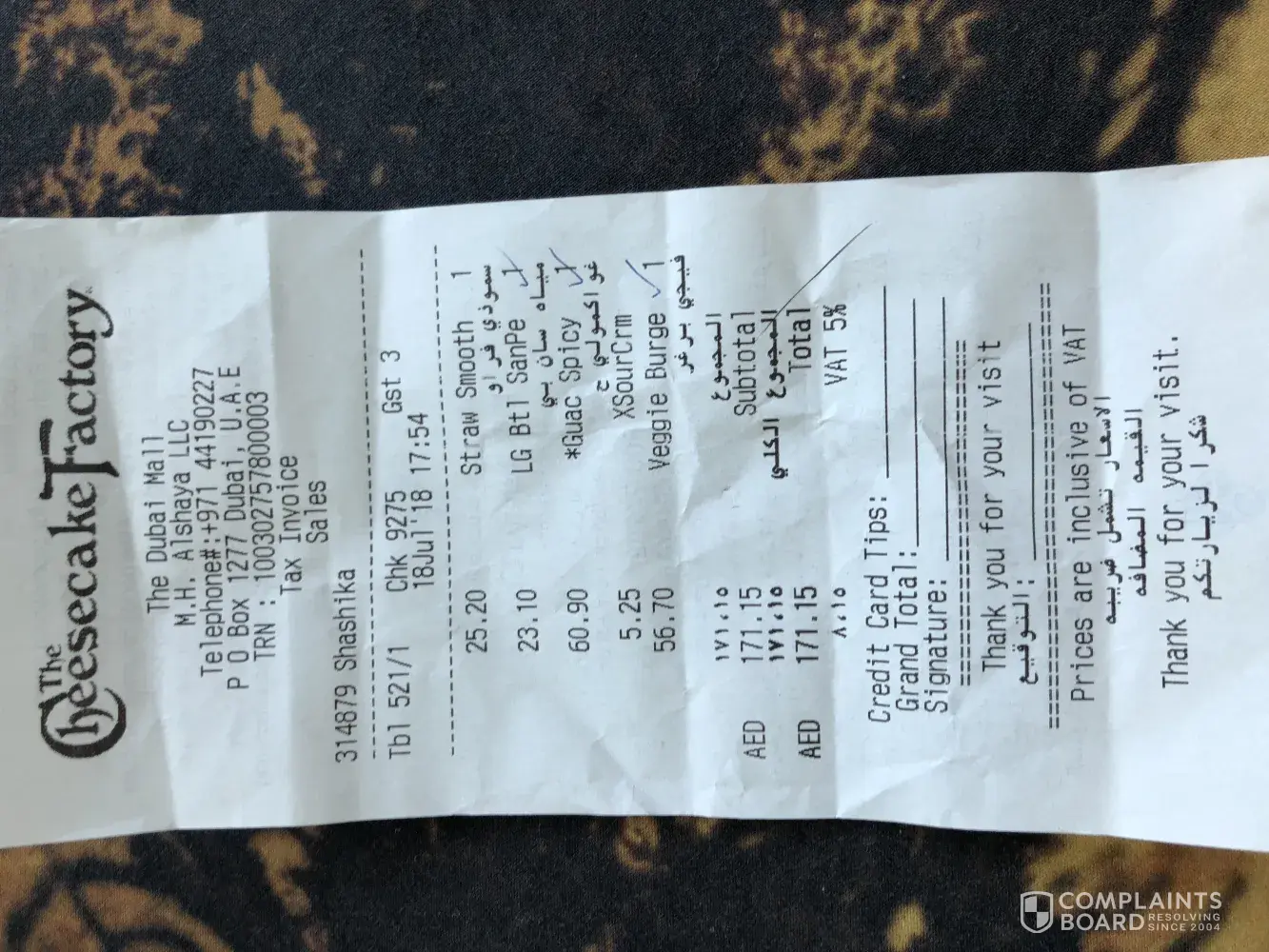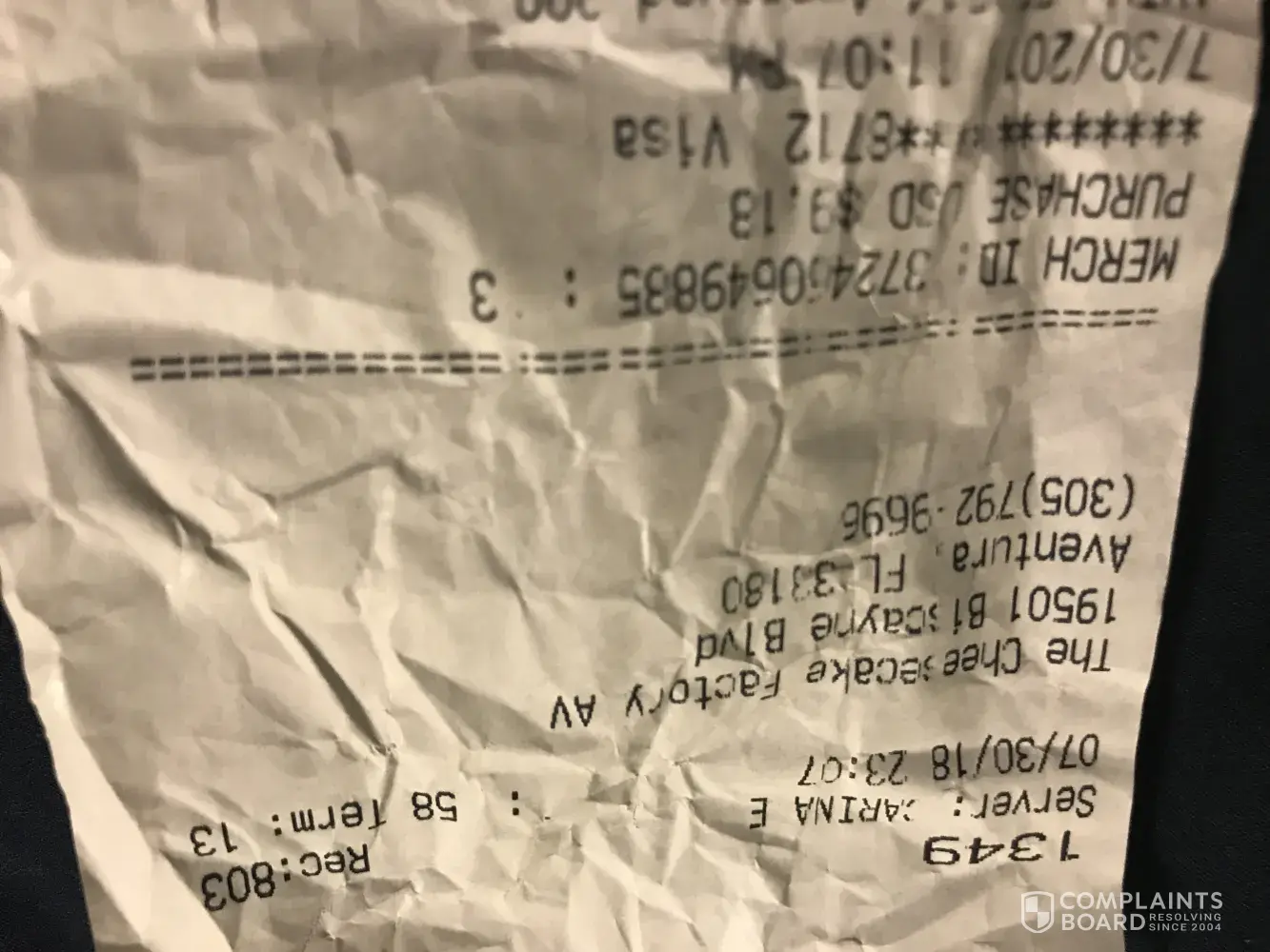 This could happen again. Is this the policy of the Cheesecake Factory? I'm planning on putting this on Facebook to let other people know how they may be treated if they don't leave a tip to a waiter. His conduct was unprofessional and scary. This is something that you really need to address. My plan is to go to Columbia to talk to the manager and to see if this man is still there.