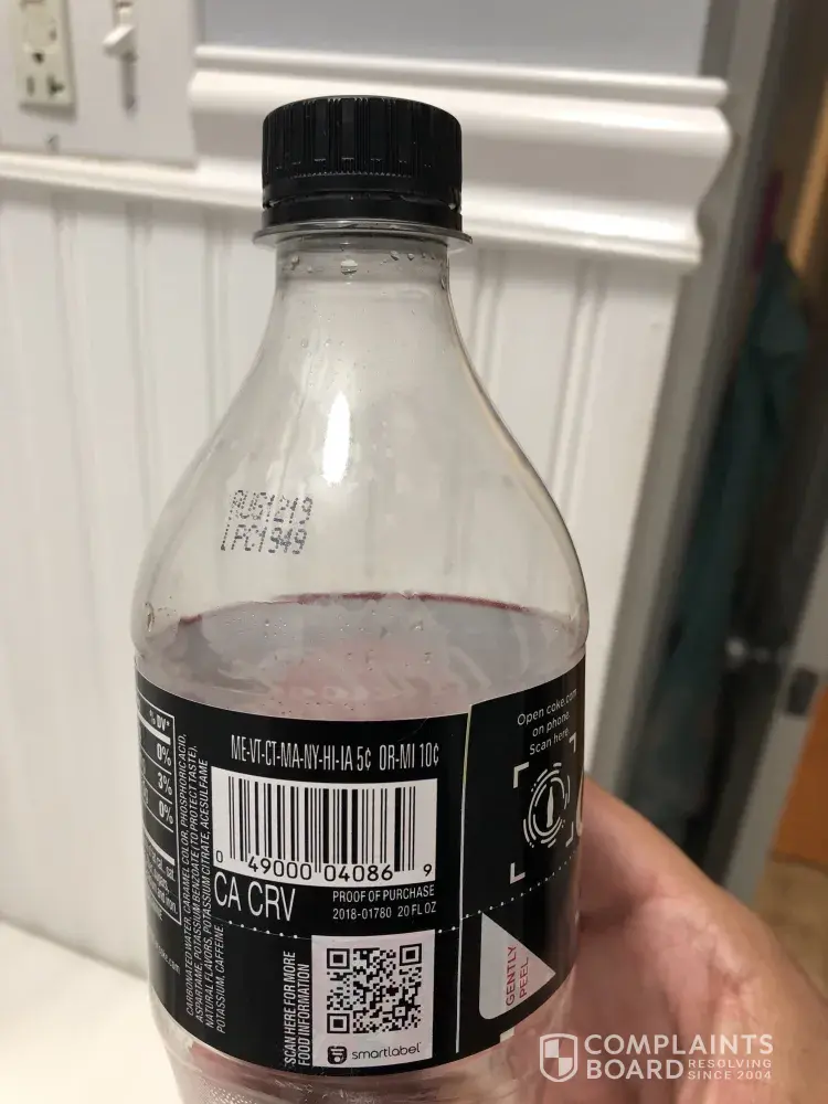 Thank you for sending this. I just filed a complaint with Coca-Cola as well. The 20oz Diet Cokes are the exact same way! I have bought 4 different Diet Cokes from different vendors with the same exact issue. It is the recycled plastic bottles and lids that smell absolutely disgusting!