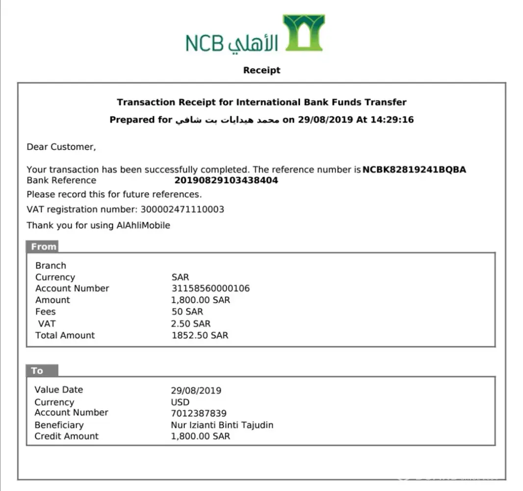 Ivm Muhammd Hidayat Bin Shafie (Iqama: [protected])had made two international remittance transactions last 3 week ago from my Al Ahli account to two beneficiaries in Malaysia. However, until now both of them still didn't receive the money. I already call the correspondence banks in Malaysia, but the bank said, they still didn't receive the money from NCB.